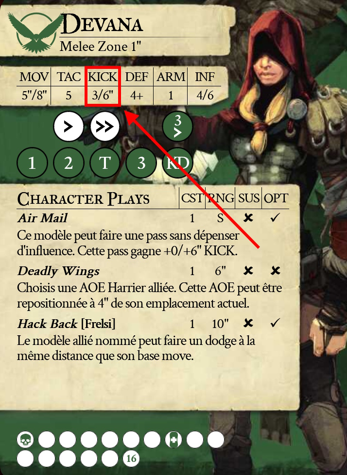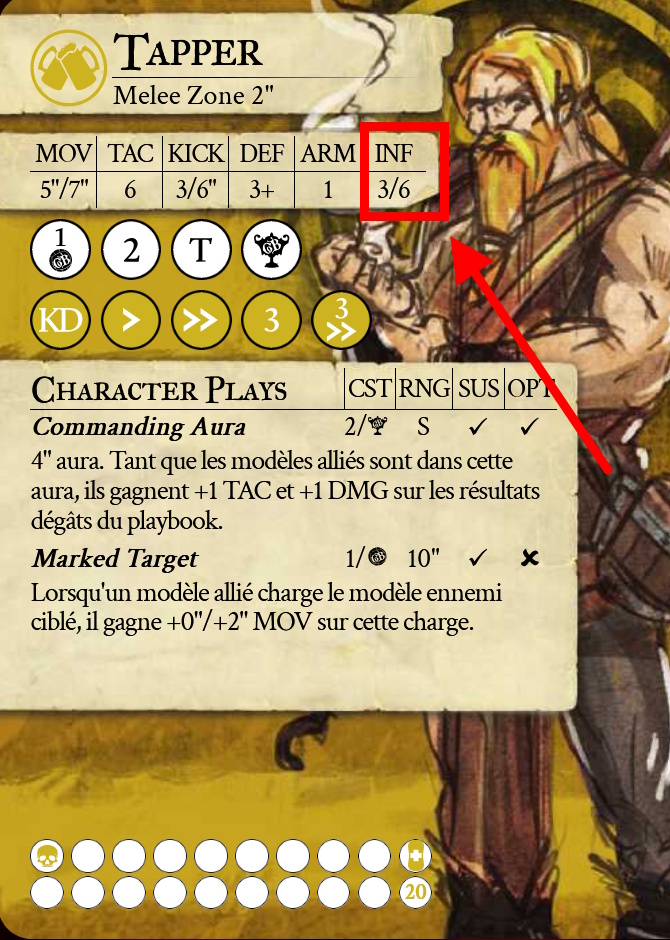 Au début du tour, chaque joueur sur le terrain génère de l’influence. La quantité qu’il génère est propre à chaque figurine. C’est une caractéristique de son profil. L’influence servira à entreprendre des actions, comme Sprinter (1 point d’influence), Charger (2 points) ou faire une Passe (1 point) pour n’en citer que quelques-unes.