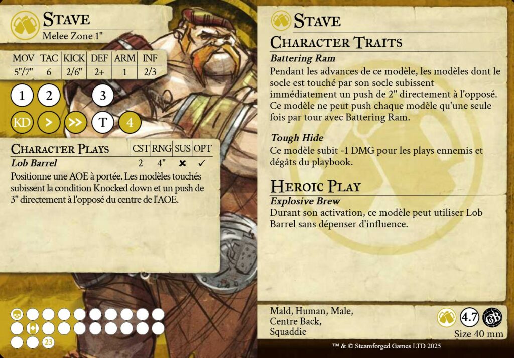 Comme je le disais en début d’article, chaque personnage est unique. Chacun dispose d’aptitudes spéciales que vous pourrez activer en dépensant le coût d’influence associé. Par exemple, le Brasseur Stave a la capacité de jeter des barils de bière sur ses adversaires, infligeant l’état Mis à Terre suivi d’une poussé de 3″. Tandis que l’Alchimiste Smoke peut lancer une Bombe Fumigène, qui résulte en un effet de zone persistant offrant le couvert à tous les joueurs en son sein.