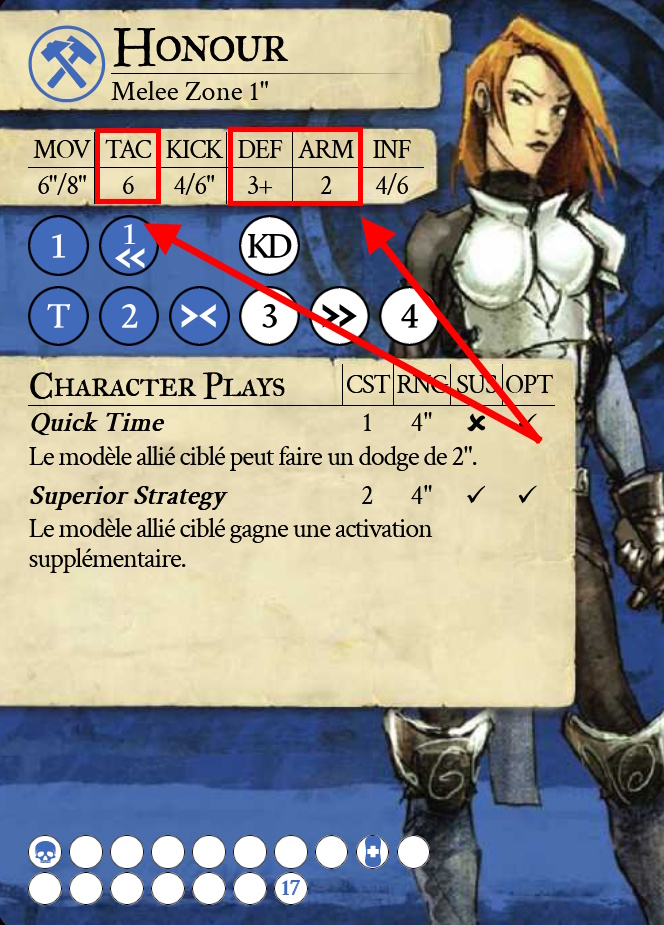 Avec un 3+ en défense, un adversaire qui la prend pour cible devra au moins obtenir des résultats de 3 ou plus pour valider des réussites. Mais avec son armure de 2, Honour pourra parer 2 réussites.