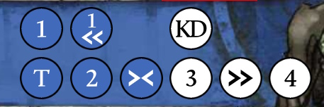 Ce tableau, composée systématiquement de 2 lignes et de jusqu’à 6 colonnes, liste un ensemble d’effets: le tacle (T), la feinte (<), la poussée (>), la mise à terre (KD), le dégât (#) et parfois même un talent spécial (GB). Ce Guide Stratégique se lit de gauche à droite et fonctionne comme un panel de récompenses en fonction du scoring de votre attaque. Plus celle-ci contient de succès, plus vous débloquez des colonnes et donc un choix plus large dans les effets que vous aimeriez appliquer.