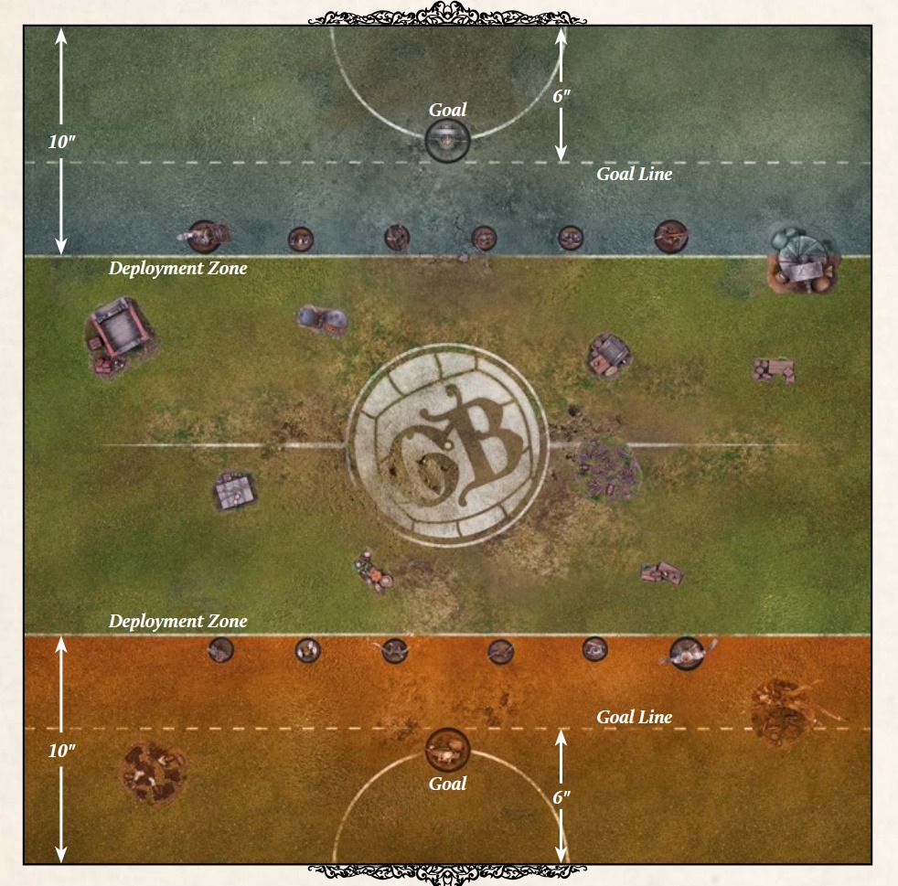 Le format classique de Guild Ball se joue sur un terrain de 91x91cm (3’x3 ‘). Il est divisé en deux parties: un côté pour chaque équipe. À six pouces des lignes de fonds sont érigés les poteaux de but. Cet avancement par rapport au bords du terrain offre le loisir aux joueurs tourner autour des buts, à l’instar des cages au hockey sur glace. Notez cependant que le goal n’est pas une armature avec une entrée unique. Il s’agit d’un élément de terrain sur un socle de 50 mm de diamètre qu’il faudra toucher avec le ballon pour scorer les 4 points.