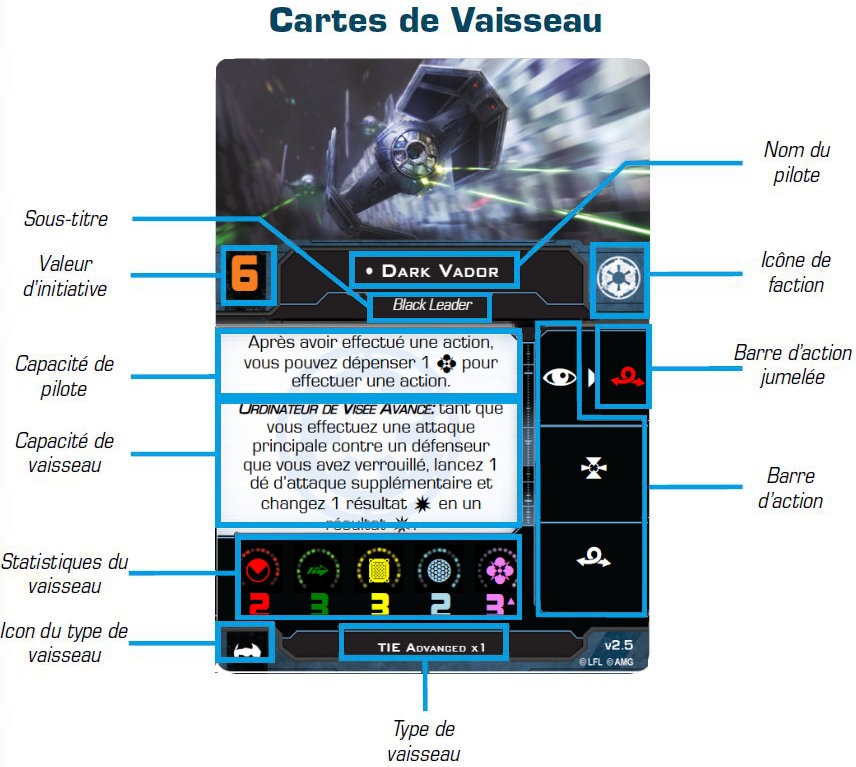 Les vaisseaux sont caractérisés par 4 à 5 statistiques : les dégâts, l’agilité, la coque, les boucliers et la force pour les pilotes sensibles à cette énergie mystique. On trouvera également l’initiative, les actions et les capacités du pilote et/ou du vaisseau.