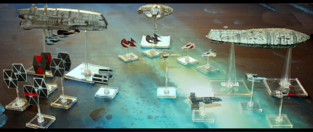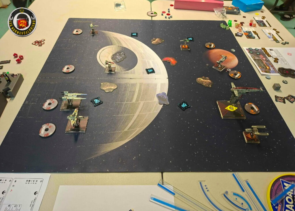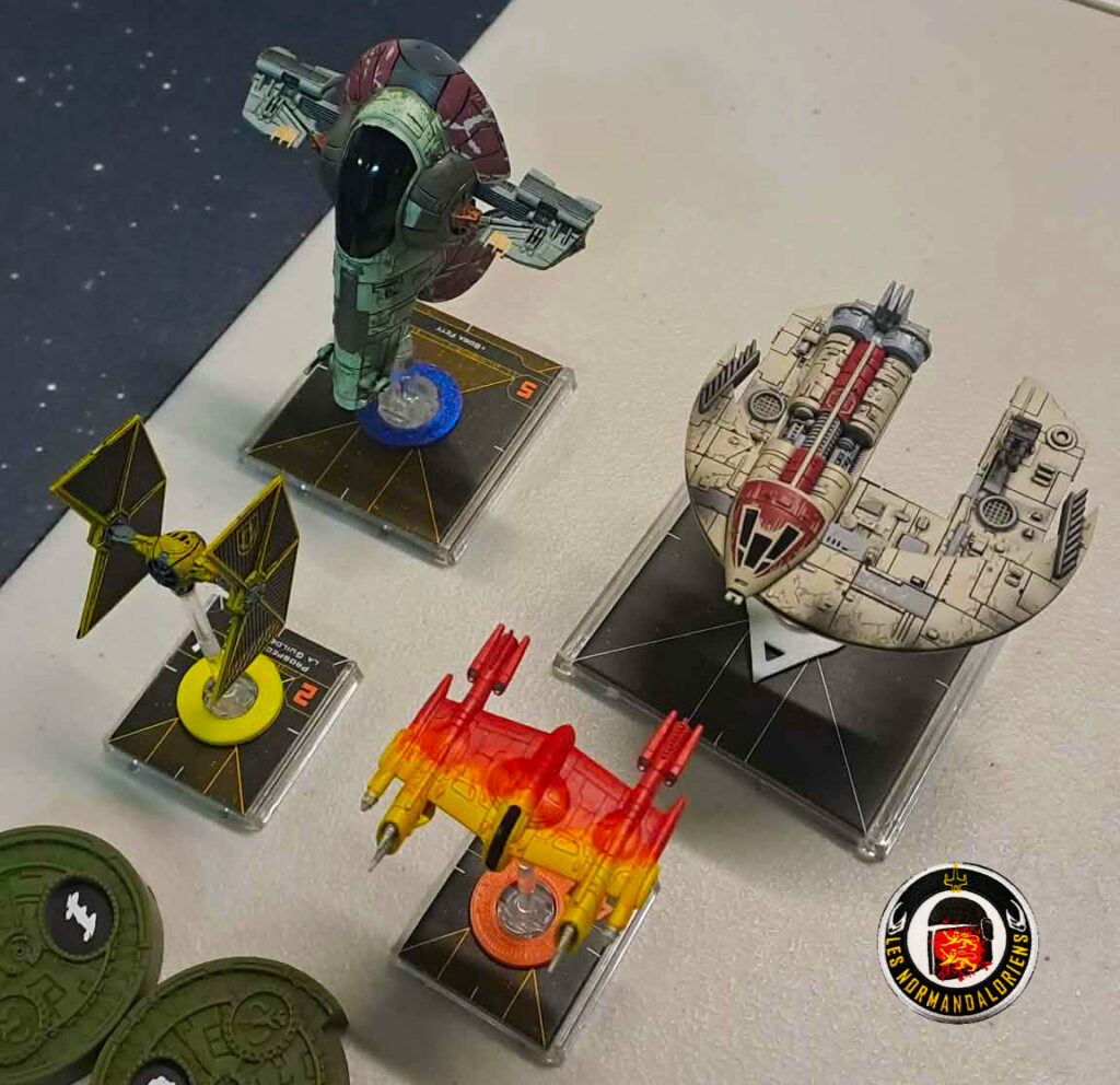 Dans un premier temps chacun compose son escadre. Chaque vaisseau a une valeur et dispose de ses propres points d’acquisitions pour son équipement. Au menu, torpilles, modifications, compétence, équipage (Chiktaba2 par exemple)… tout ce qu’il faut pour équiper votre appareil. La quasi totalité des personnages rencontrés dans la fresque qu’est Star Wars est disponible pour combattre à vos côtés. Le nombre de points de création est typiquement de 50 autorisant un minimum de 3 et un maximum de 8 chasseurs par équipe. Un builder (application en ligne qui vous guide pas à pas lors de la création de votre escadre) vous aidera pour monter votre équipe. Un tuto en anglais ici (le plus « récent ») et un autre ici en français plus détaillé.