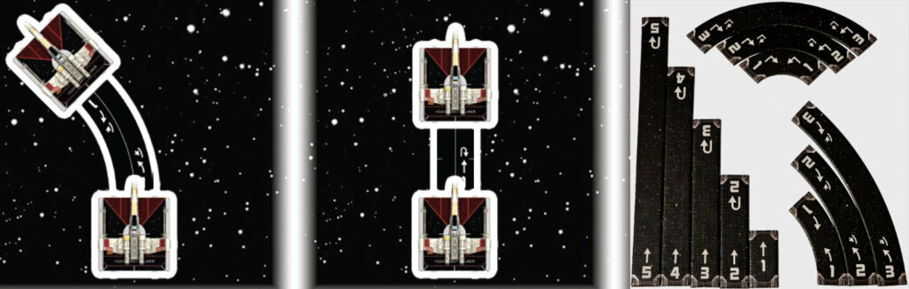 Les différents type de vaisseaux dispose d’un cadran attitré pour réaliser leurs manœuvres. Plusieurs gabarits vont leur permettre de se déplacer. Hormis les virages et les lignes droites, certains peuvent faire un tonneau, un demi-tour ou un dérapage enrichissant les possibilité de placement sur le terrain (l’espace donc). Selon la complexité du mouvement, le pilote peut se trouver en situation de stress, bridant ses capacités d’action. Des astéroïdes, des mynocs ou des débris (liste non-exhaustive) nécessiteront un pilotage plus subtil donc un choix judicieux de manœuvres sous peine de finir en super nova.