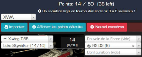 Luke Skywalker et son X-Wing pour une valeur de 14pts et un total de 10pts a alloué à son équipement tel R2-D2 qui vaut 8pts
