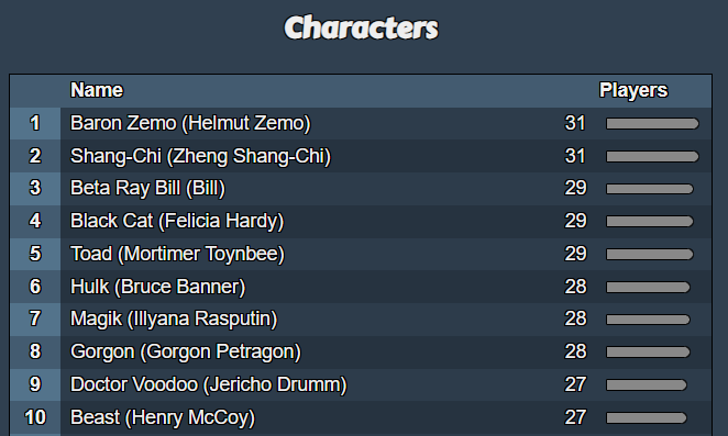 As expected, we find the most valuable Horsemen for Apocalypse: Beast, Toad, and Magik. Hulk once again proves his status as the best 6-threat in the game, especially in an Avengers-heavy environment. Voodoo remains at the top of the Meta despite his so-called “nerf” a while ago. Shang-Chi, as reliable as ever, finally reaches the first place tied with Zemo — a position fully justified by his current omnipresence in the game. Yet, the long-awaited nerf still hasn’t arrived. Notably, Gorgon makes a strong entrance straight into eighth place, likely helped by the overrepresentation of his affiliation.